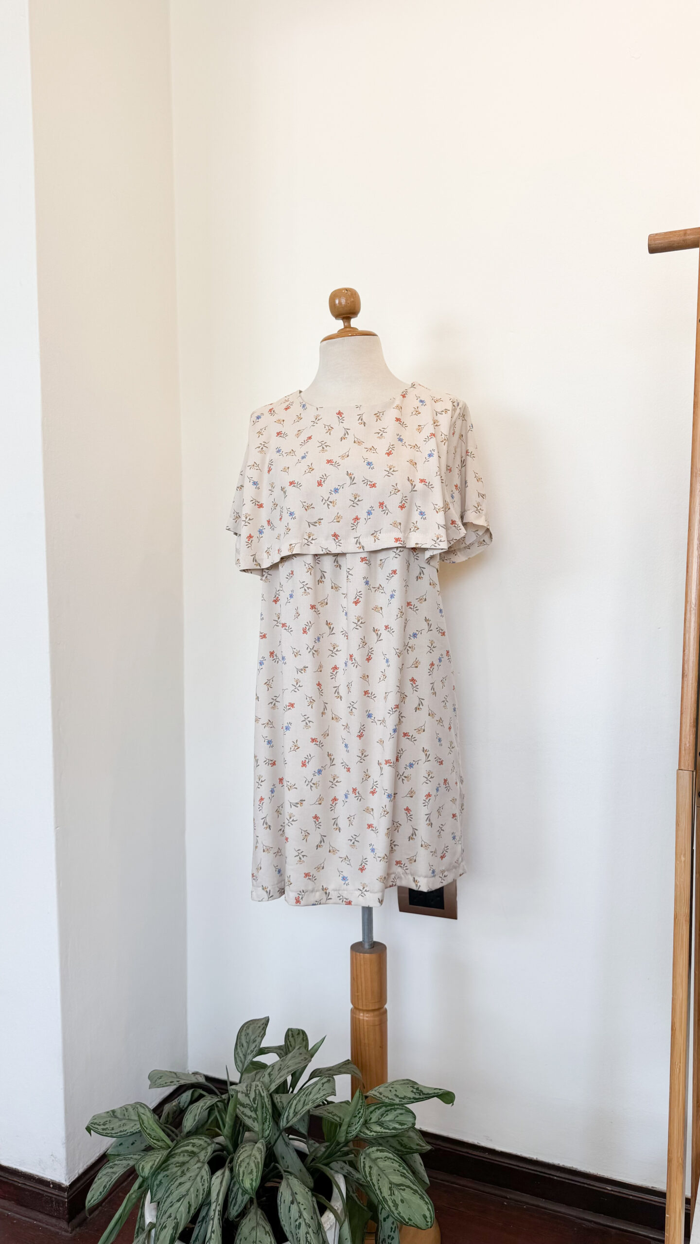 Su tono beige con print floral delicado lo hace fácil de combinar y perfecto para trabajo o reuniones de día.